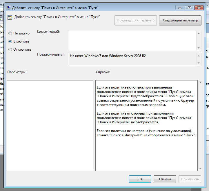 После чего двойным нажатие левой кнопкой мыши по "Добавить ссылку «Поиск в интернете» в меню «Пуск»" - откроется окно, в котором меняем с "Не задано" на "Включить"